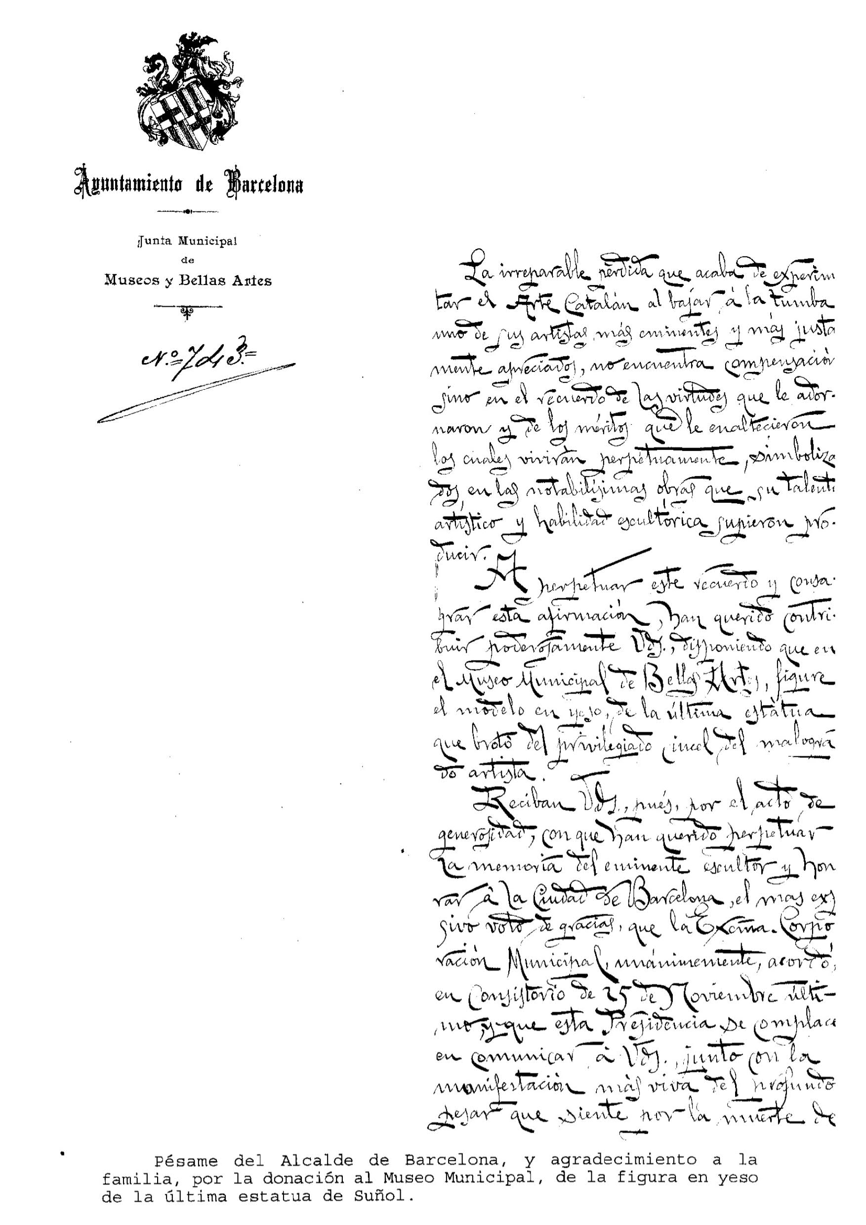 (Transcripción del pésame del Alcalde Barcelona, y agradecimiento a la familia Suñol, por la donación al Museo Municipal de la figura en yeso perteneciente a la última estatua del artista)