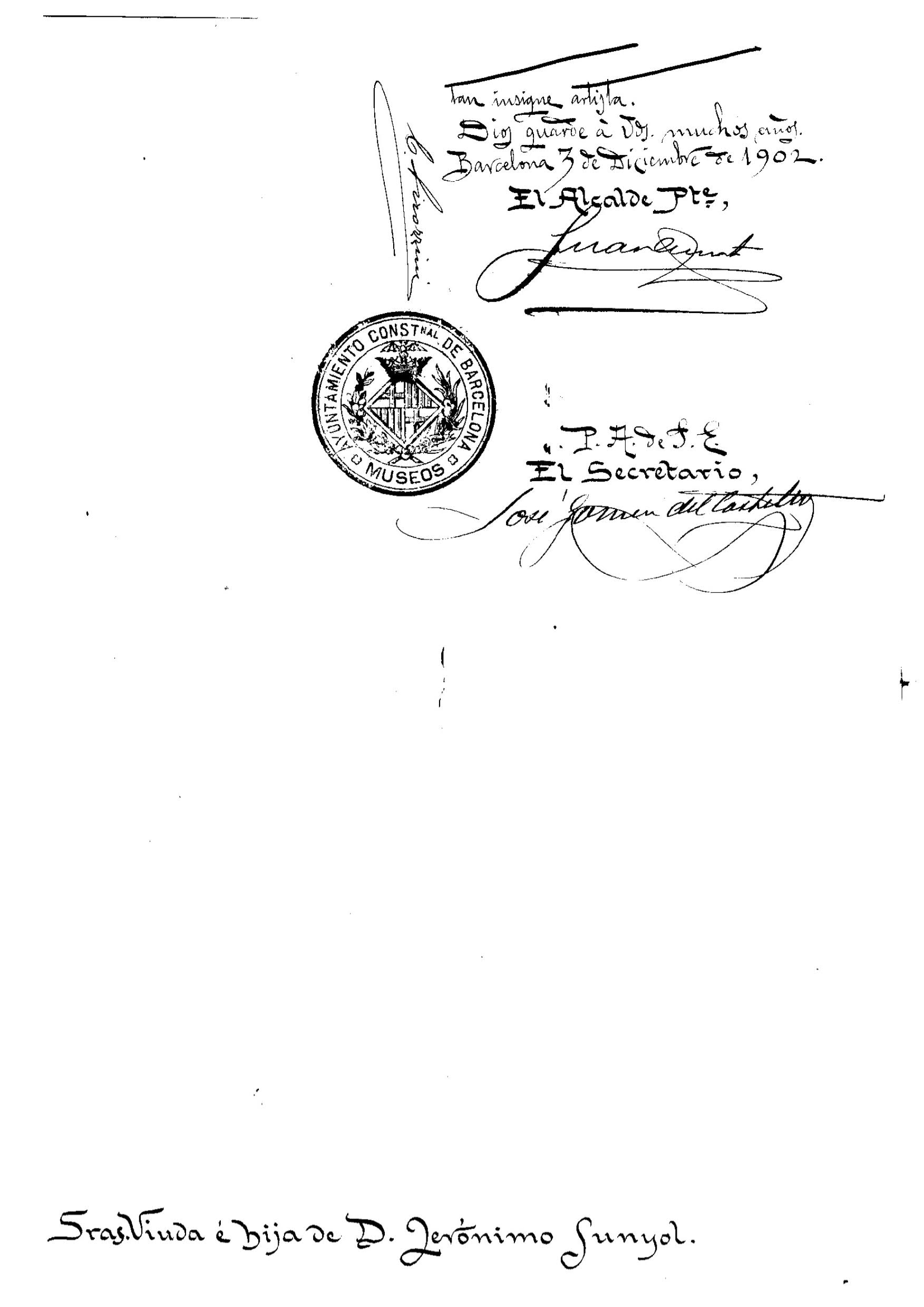 Reciban ustedes, pues, por el acto de generosidad, con que han querido perpetuar la memoria del eminente escultor y honrar a la Ciutat de Barcelona, el mas expresivo voto de gracias, que la Excma. Corporación Municipal, unánimemente, acordó en Consistorio de 25 de Noviembre último, y que esta Presidencia se complace en comunicar a ustedes, junto con la manifestación mas viva del profundo pesar que siente por la muerte de tan insigne artista.