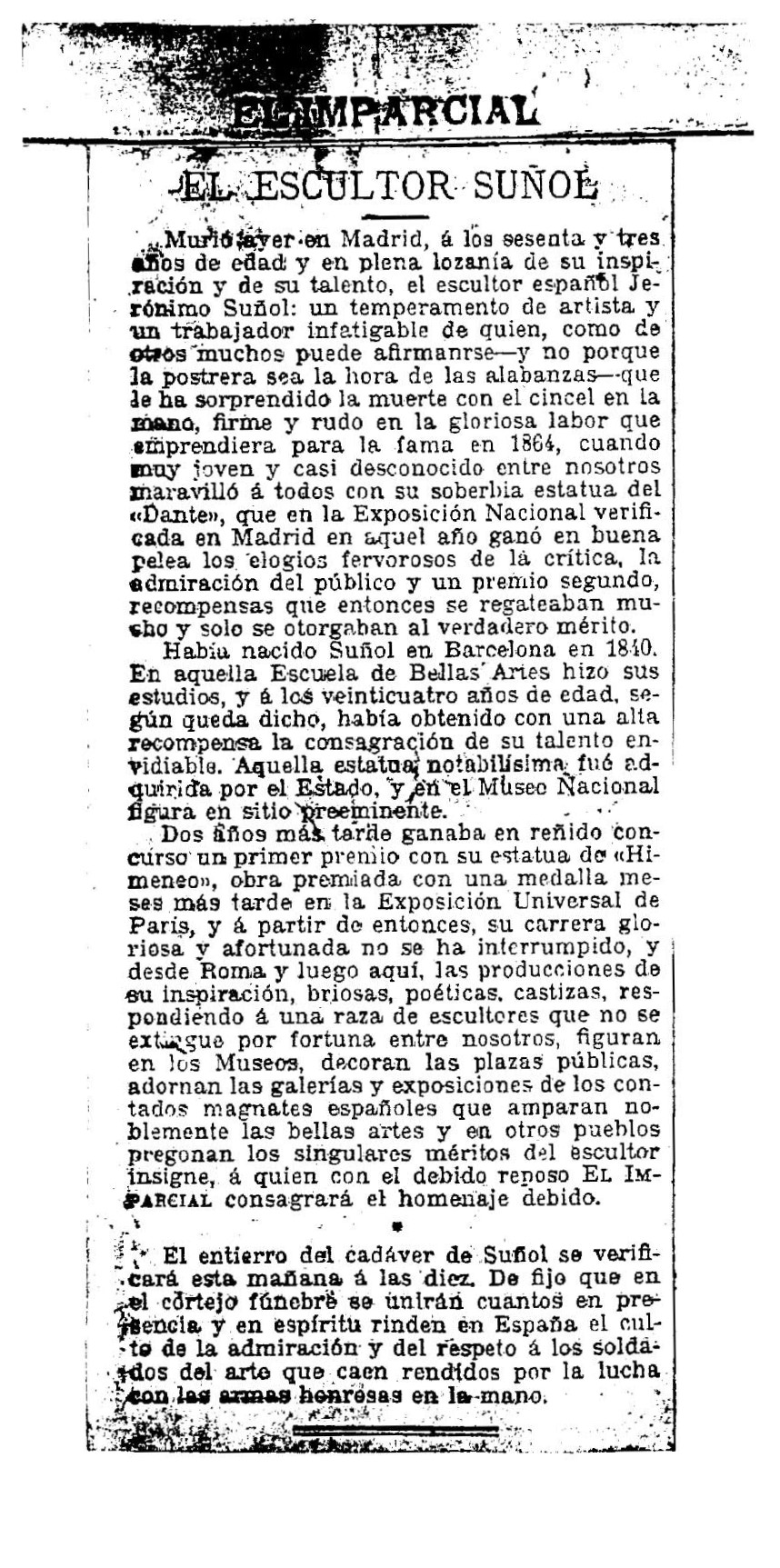 Murió ayer en Madrid, a los sesenta y tres años de edad y en plena lozanía de su inspiración y de su talento, el escultor español Jerónimo Suñol: un temperamento de artista y un trabajador infatigable de quien, como de muchos otros muchos puede afirmarse - y no porque la postrera se al hora de las alabanzas. Que le ha sorprendido la muerte con el cincel en la mano, firme y rudo en la gloriosa labor que emprendiera para la fama en 1864, cuando muy joven y casi desconocido entre nosotros maravilló a todos con su soberbia estatua del «Dante», que en la Exposición Nacional verificada en Madrid en aquel año ganó en buena pelea los elogios fervorosos de la crítica, la admiración del publico y un premio segundo, recompensa que entonces se regateaban mucho y solo otorgaban al verdadero mérito.