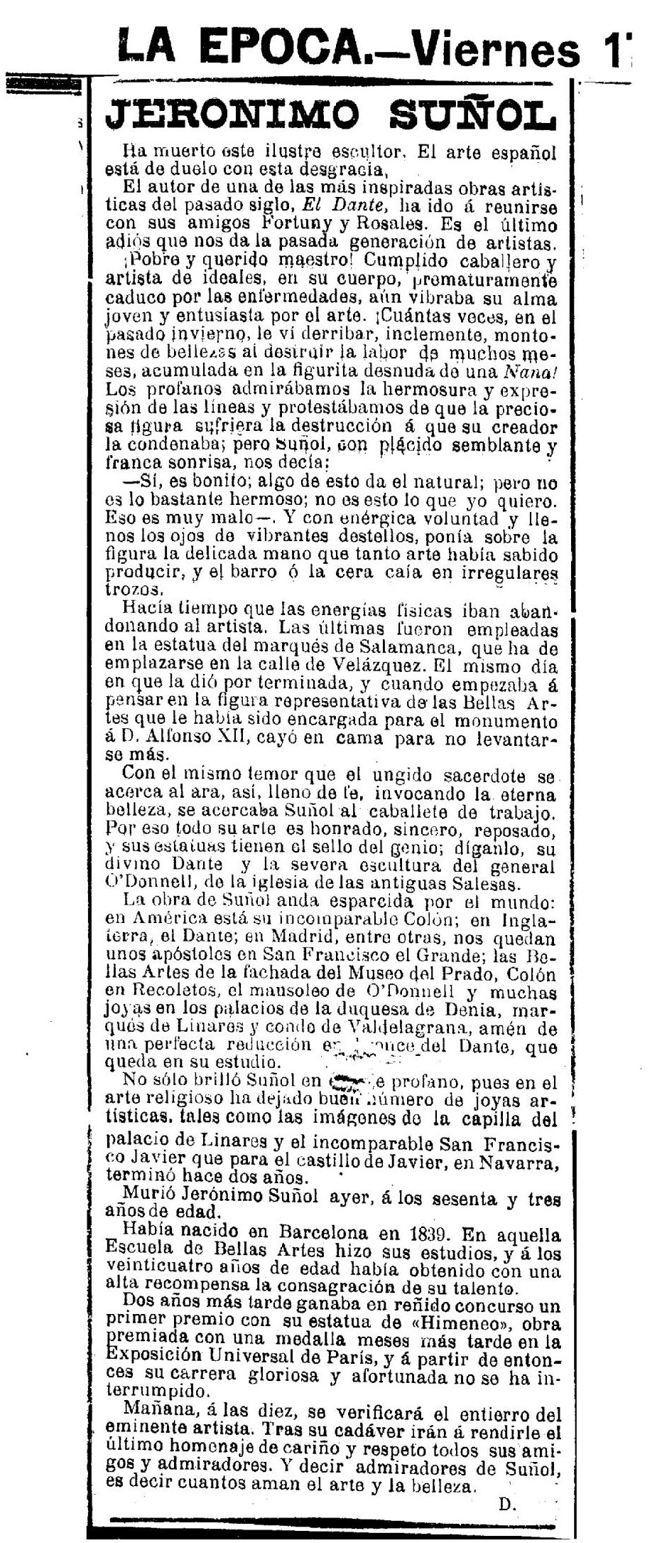 Mañana, a las diez, se verificará el entierro del eminente artista. Tras su cadáver irán a rendirle el último homenaje de cariño y respeto todos sus amigos y admiradores. Y decir admiradores de Suñol, es decir cuantos aman el arte y la belleza.