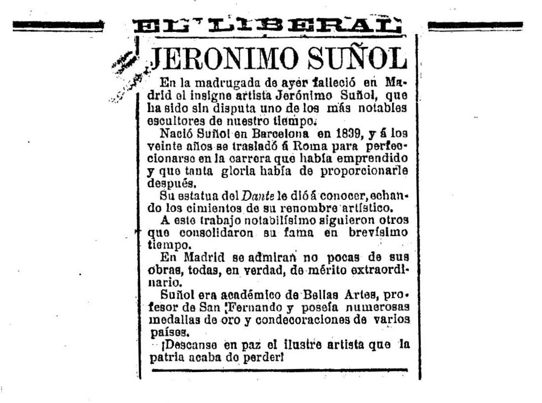 En la madrugada de ayer falleció en Madrid el insigne artista Jerónimo Suñol, que ha sido sin disputa uno de los mas notables escultores de nuestro tiempo.